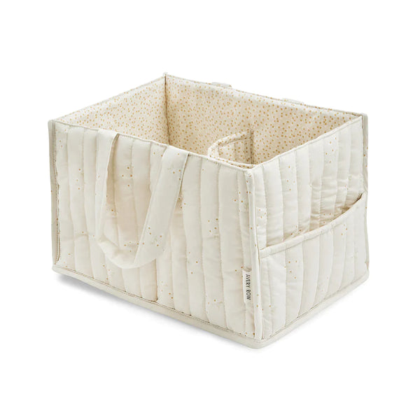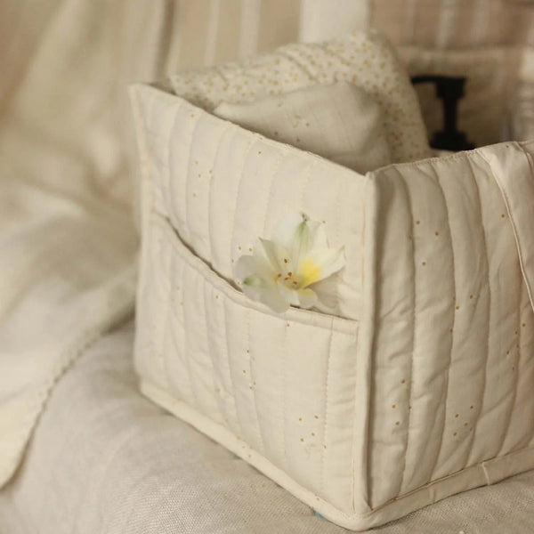 The perfect addition to your baby changing station. Our quilted nappy caddy has 2 outer pockets and 3 inner compartments, perfectly sized for storing nappies, creams and wipes. Handles make the caddy portable so your baby changing essentials can always be close to hand.