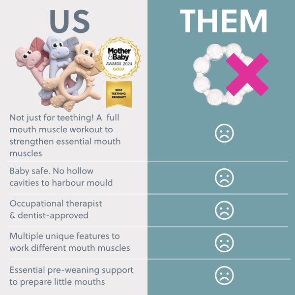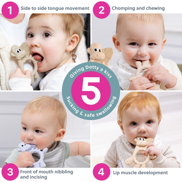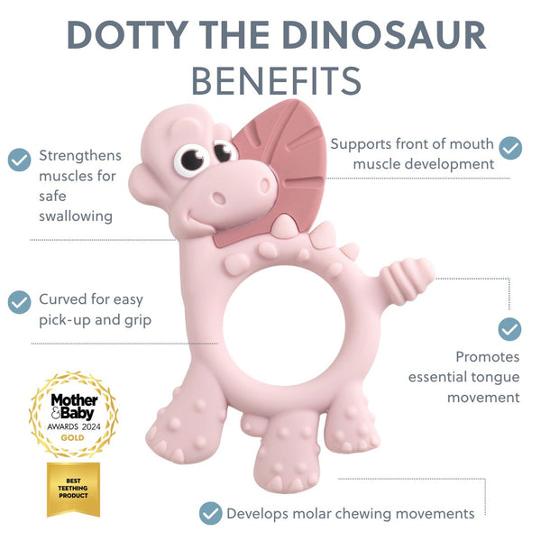Dotty the Dinosaur™ is a Multi-Sensory Teether designed to strengthen and develop mouth muscles and help curious mouths unlock the secrets to biting and chewing.