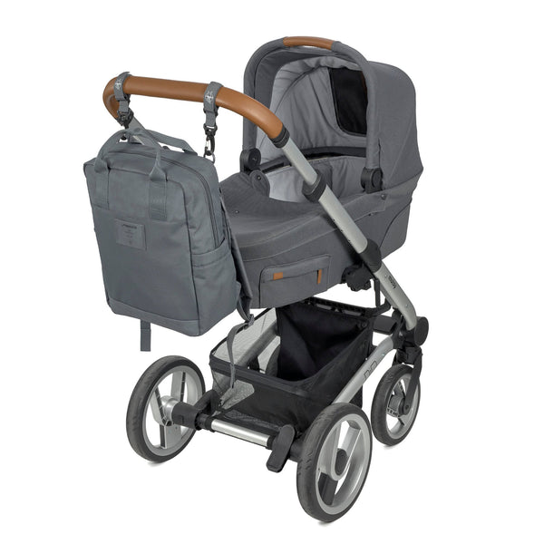 The backpack has an attractive modern look, but it is equally impressive in terms of cleverly laid-out storage space, large top opener and bright interior lining. The various different practical compartments inside and outside have been dimensioned to take all the important items for changing diapers when you and your baby are away from home. The elasticated exterior pouches offer space for different-sized drinking bottles, an umbrella, etc. Inside is a mesh pocket for dry diapers and a waterproof pocket for wet ones.