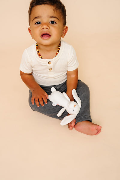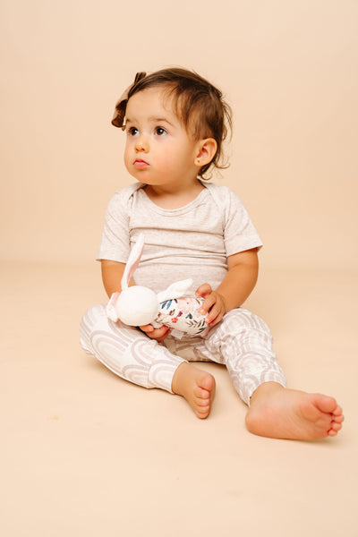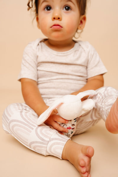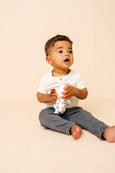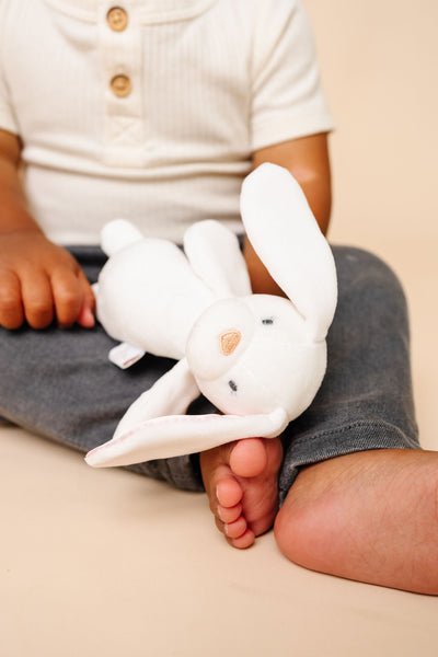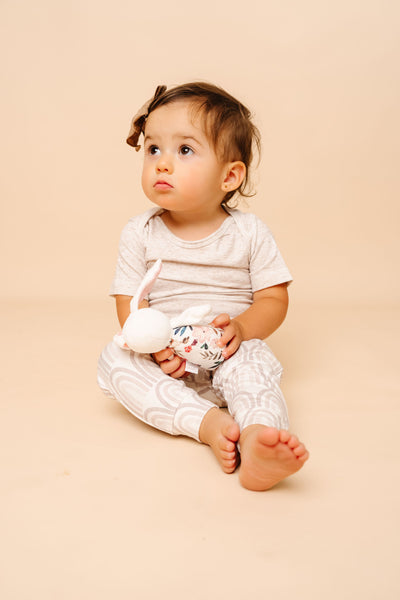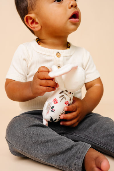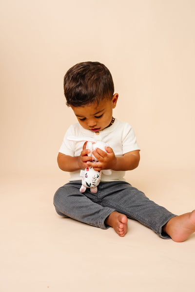 Designed for little hands, this pint-sized pal is easy for baby to grab. Made with supersoft fabric, this adorable stuffed rattle offers sensory engagement with a gentle bell sound and ultra-luxe materials.