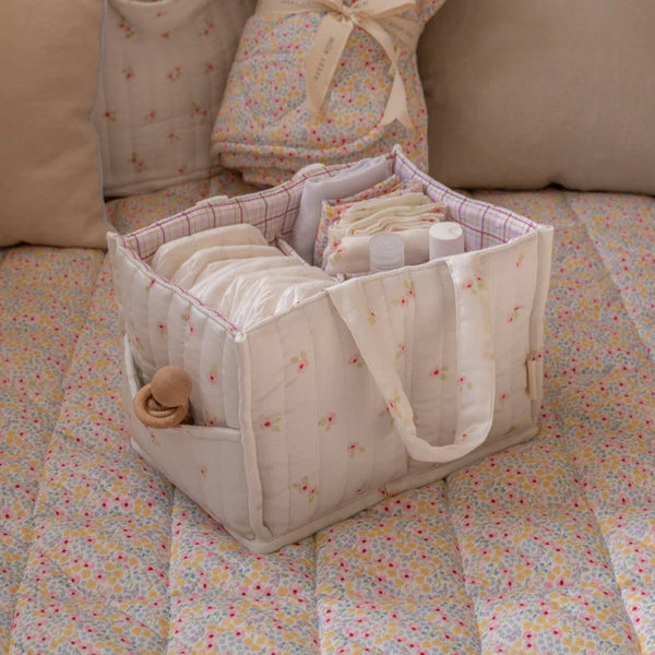 The perfect addition to your baby changing station. Our quilted nappy caddy has 2 outer pockets and 3 inner compartments, perfectly sized for storing nappies, creams and wipes. Handles make the caddy portable so your baby changing essentials can always be close to hand.