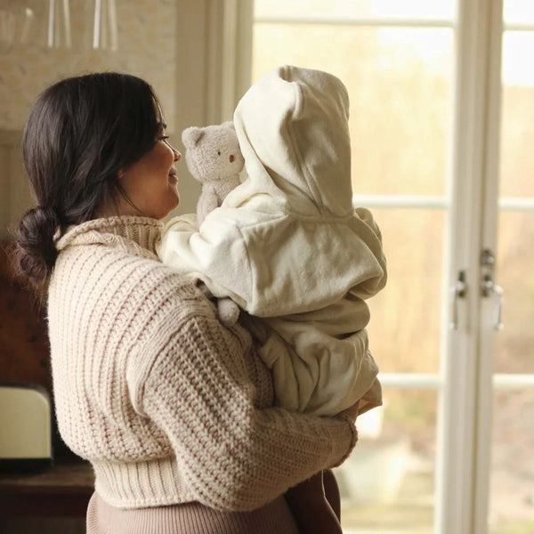 This organic cotton terry towelling hooded robe is beautifully soft for the most delicate skin. Perfect for bath times or to use as a dressing gown.