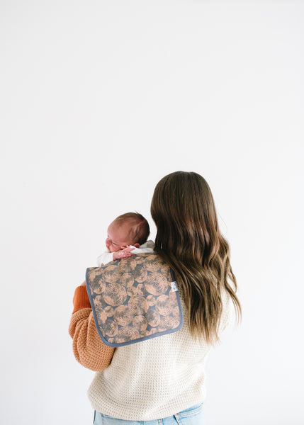 Baby burp time is suddenly on point thanks to the trendy, beloved fabrics that made you fall in love with Copper Pearl!  Who would have thought baby could spit up in style?  Designed to pair perfectly with our bandana bib sets, the front of each fashion-forward burp cloth comes in modern, chic patterns on 100% cotton. The “fashion meets function” Copper Pearl standard strikes gold again with these burp cloths; the dreaded leakage of spit up and drool onto parent clothing are a problem of the past!  A middle fleece layer provides superior absorbency, stopping those unpleasant baby fluids in their tracks.  A generous 21x10 inch size provides greater shoulder coverage (and less outfit changes) for Mom and Dad.  A must-have essential for any new or seasoned parent, our Copper Pearl burp cloths make the perfect gift for any occasion.