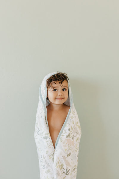 Who says tub time can't be trendy? Fashion meets function yet again with Copper Pearl Hooded Towels, a bath time routine essential with elevated style.  100% cotton muslin, in modern patterns and colors, is paired with fluffy terry cloth to provide the ultimate warmth and comfort. Each of our towels is crafted with a cozy hood and pint-sized pockets, the perfect way to keep little heads and hands warm and snuggly at tub time.