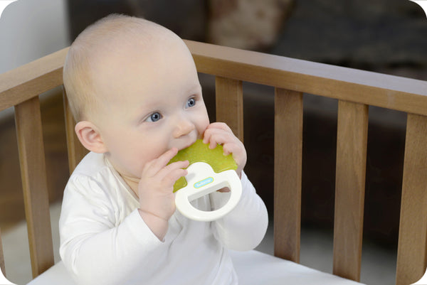 The soother has an easy grip handle with beads to create a gentle rattling sound. It is great for teething relief if it is first placed in the refrigerator to cool.