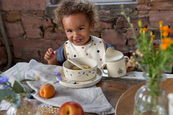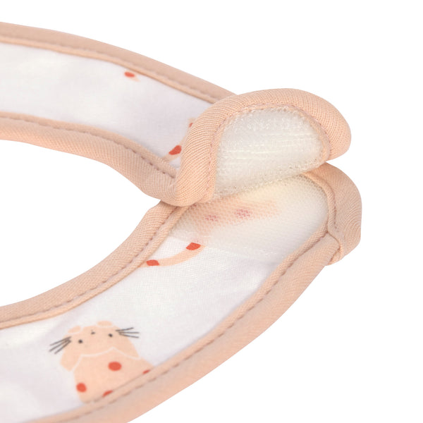 The bibs, which come in a multiple assortment, are equipped with practical hook-and-loop fasteners for easy attachment and removal. The front is made of 100% cotton (organic).