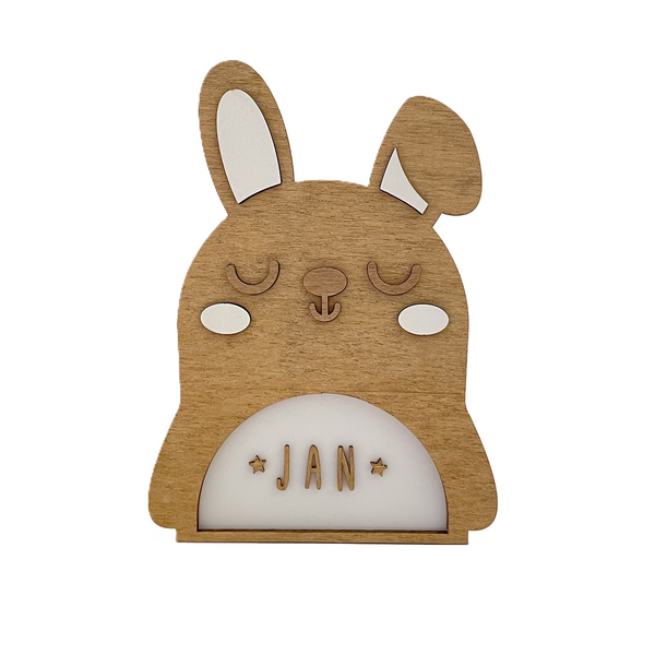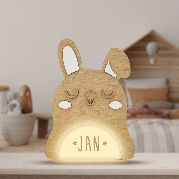 Night lights in the shape of a cute bunny. Its belly lights up when you turn it on. Like all our products, you can personalize the lamp with the name you want as it comes with the letter and symbol kit.